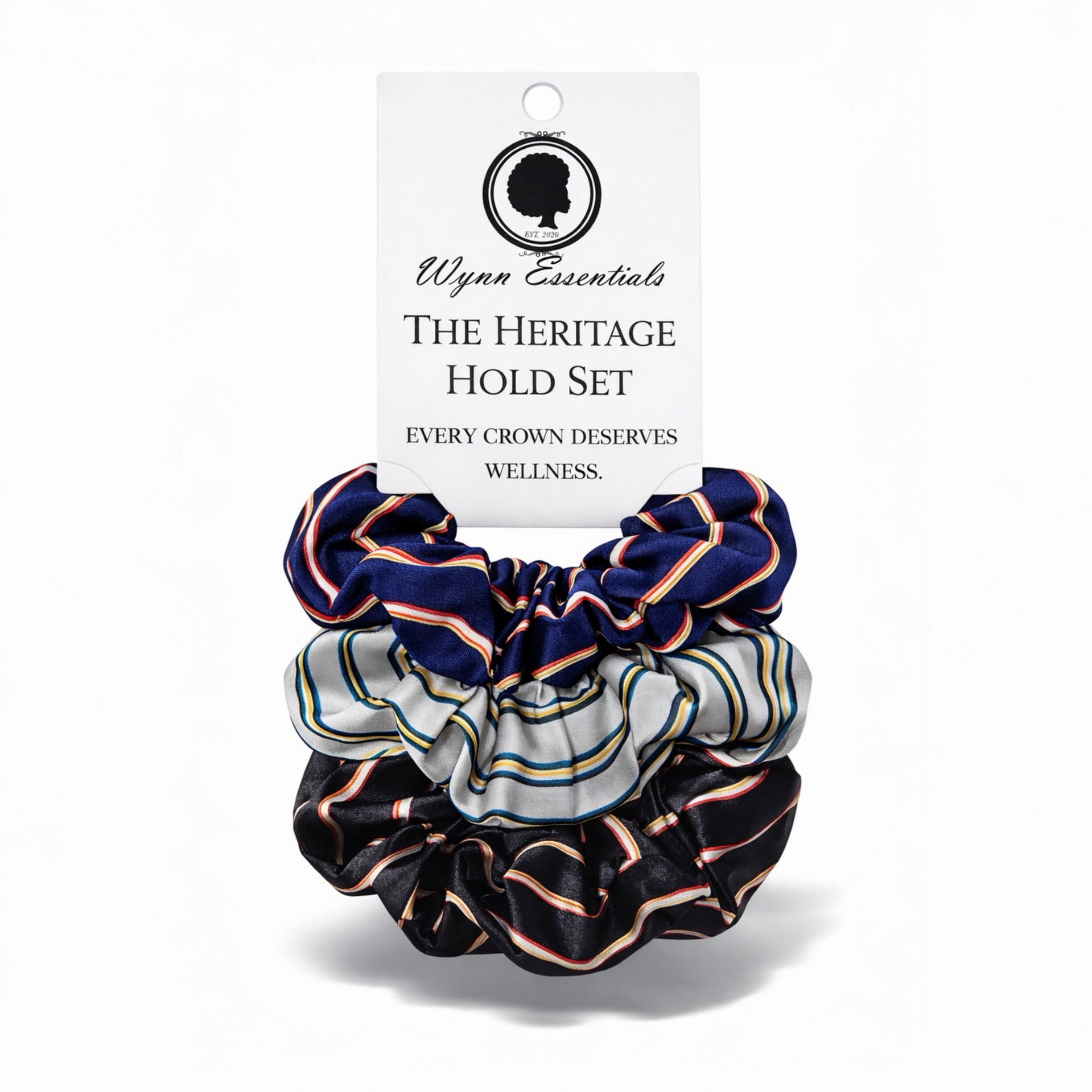 The Heritage Hold Satin Scrunchie Set is designed as part of the Wynn Essentials Hair Wellness System, created to secure your style while protecting your strands. With blended timeless structure and modern hair wellness, the refined striped design nods to classic heritage styling. The smooth satin surface helps reduce friction, minimize tension, and support moisture retention so your hair stays softer, stronger, and easier to manage between styling days. Because hair protection should feel as elevated as the style itself.